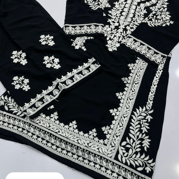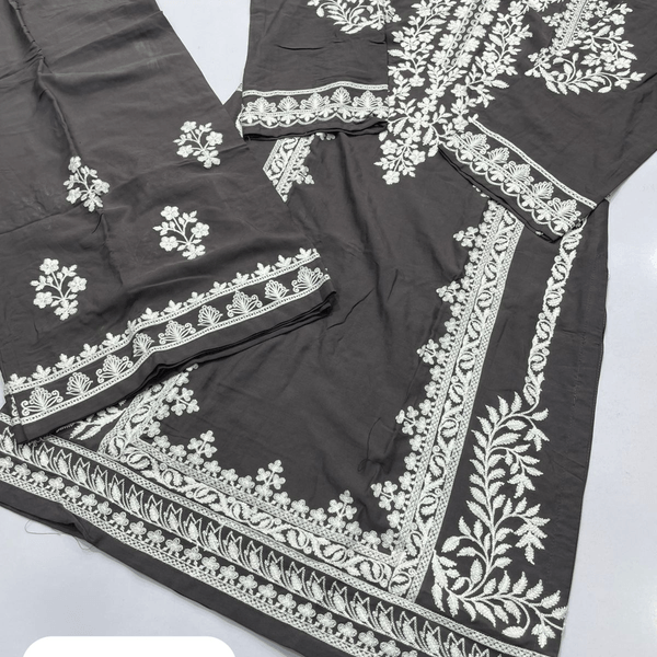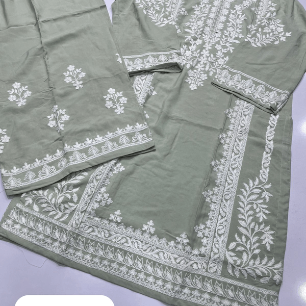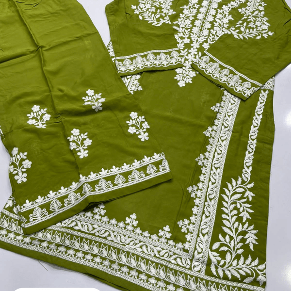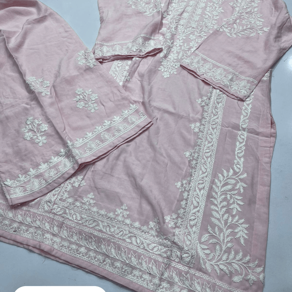Elegant and trendy 2-piece Boski linen suit featuring beautiful chicken embroidery with a modern bell bottom trouser des Read More